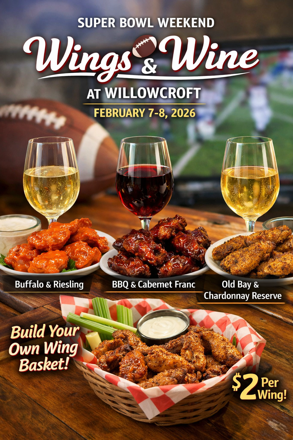 Who says wings are only for beer? Super Bowl weekend at Willowcroft is all about bold flavors and relaxed enjoyment. Our Wings & Wine Pairing experience features three wines, each paired with a different wing style—Buffalo, Barbecue, and Old Bay dry rub—highlighting how wine can complement spice, smoke, and savory seasoning.